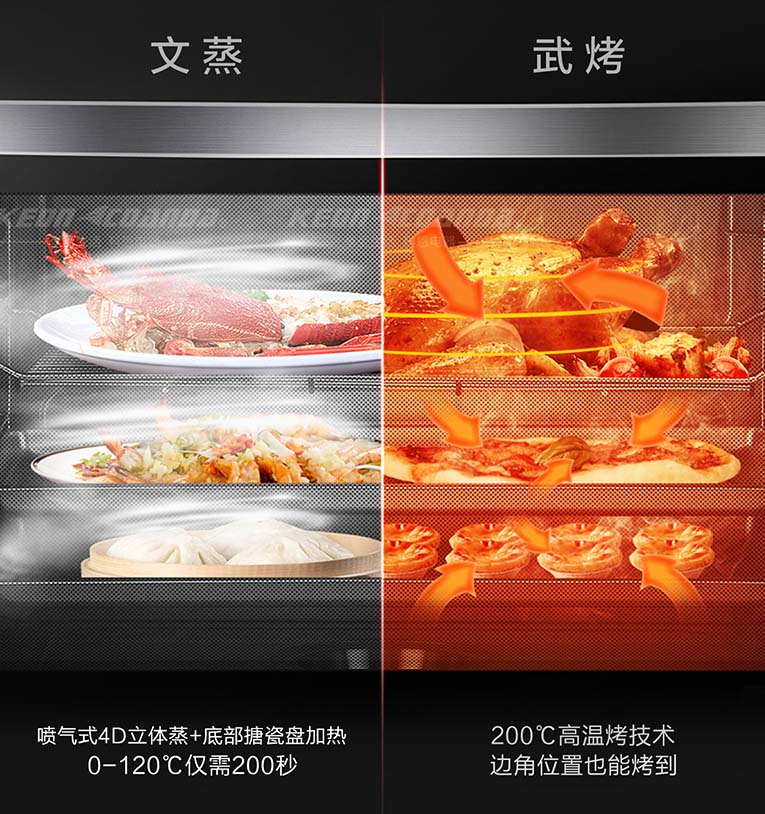 與此同時,科恩智能變頻大吸力集成灶5.0KW強勁火力,大火夠猛,小火夠穩,雙聚能環設計,熱量不流失,讓愛爆炒的用戶充分享受大火力帶來的極致體驗。可隨心調節火力大小,大火猛、小火穩,爆炒、蒸煮、燜燉等各種烹飪方式都能得心應手,給用戶們帶來暢爽的烹飪體驗,讓美食一觸即發,美味全新升級!為解決更多烹飪需求,科恩智能變頻大吸力集成灶下方搭載62L黃金容量蒸烤箱,4D立體直噴式蒸烤模式,受熱跟更均勻,頂部不滴水,智能恒溫蒸烤,多種食物不串味并保證美食色澤亮麗,營養不流失!