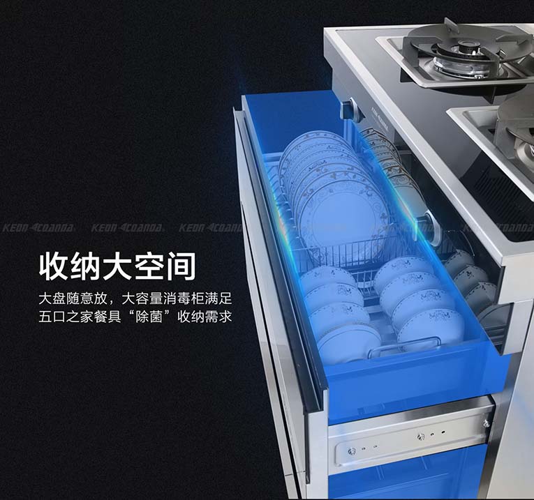 下方搭載110L黃金容量消毒柜,復式方程隱形導軌設計,有效防止導軌變形,取放方便,清掃方便,同時滿足五口之家餐具“除菌”收納需求,“碗”美收納,餐具各就各位,上下層3D立體消毒烘干設計,有效防止餐具滋生細菌產生二次污染等風險。