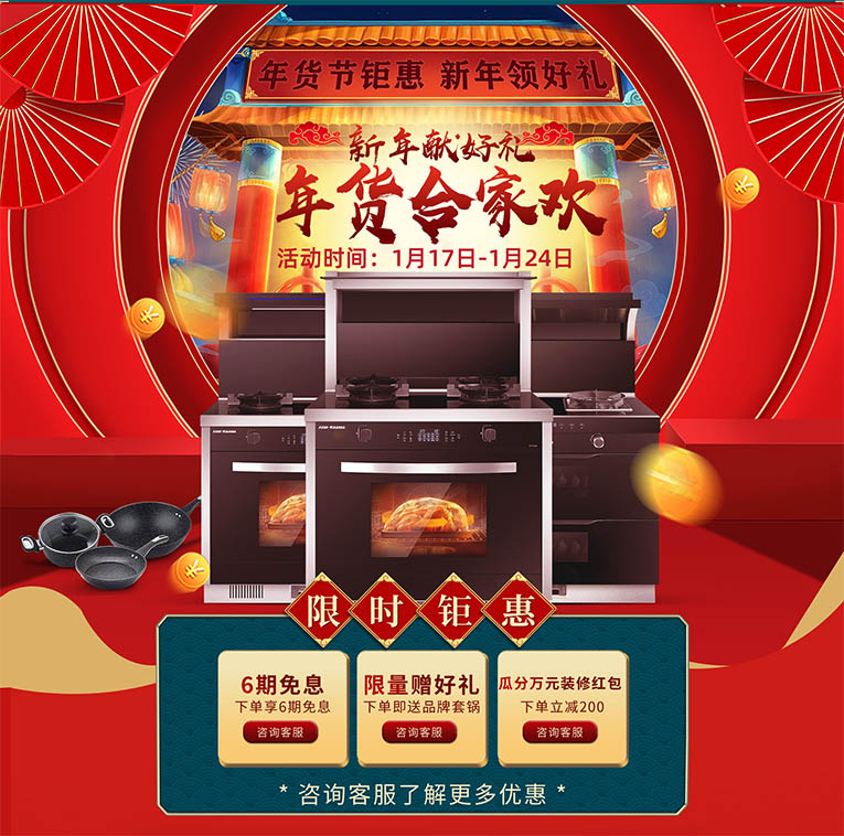 除了“年貨節”特有活動外,集成灶十大品牌、廚電行業十大品牌科恩官方旗艦店還有更多的驚喜為你呈現,跨店滿減、白條免息、瓜分萬元紅包、幸運抽獎等等。具體活動請前往京東科恩官方旗艦店了解詳情!