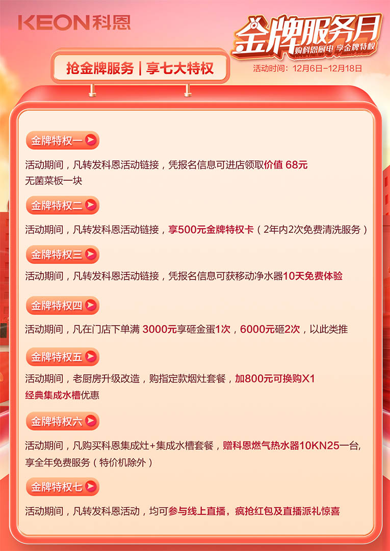 搶金牌服務,享七大特權!十大品牌科恩集成灶500元特權卡0元搶購!