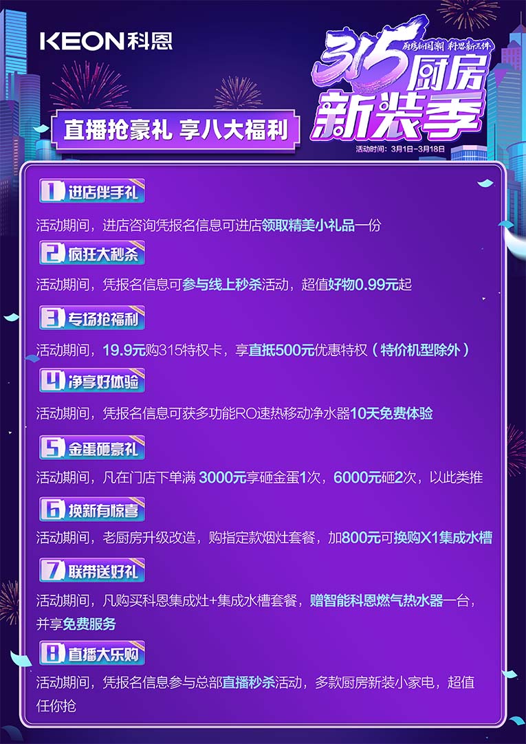 廚房新國潮,科恩新三件~科恩集成灶315廚房新裝季,八大特權限時大放送!!一進店伴手禮,活動期間進店資訊憑報名信息可領取精美小禮品一份;二瘋狂大秒殺,憑報名信息可參與線上秒殺活動,超值好物0.99元起;三專場搶福利,活動期間19.9元購315特權卡,享直抵500元特惠特權(特價機芯除外);四凈享好體驗,活動期間憑報名信息可獲多功能RO速熱移動凈水器10天免費體驗;五金蛋砸豪禮,活動期間凡在門店下單滿3000元享砸金蛋1次,6000元砸2次,以此類推;六換新有驚喜,活動期間老廚房升級改造,購指定款煙灶套餐,加800元可換購X1集成水槽;七聯帶送好禮,活動期間凡購買科恩集成灶+集成水槽套餐,贈智能科恩燃氣熱水器一臺,并享免費服務;八直播大樂購,活動期間憑報名信息參與總部直播秒殺活動,多款廚房新裝小家電,超值任你搶!