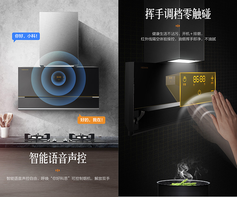 集成灶十大品牌、廚電行業十大品牌科恩新一代大吸力煙機7350還擁有智能語音控制與體感操控,呼喚“你好小科”可控制煙機。