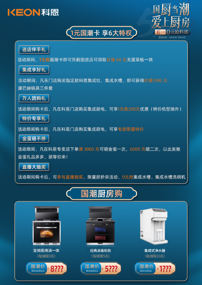 凡是購(gòu)買(mǎi)1元國(guó)潮卡的用戶即可參與直播大抽獎(jiǎng)活動(dòng):無(wú)菌菜板、PP棉濾芯、便攜榨汁杯、凈水龍頭、章丘鐵鍋、康巴赫鍋具三件套、集成水槽、集成水槽洗碗機(jī)...海量壕禮發(fā)不停!!!活動(dòng)精彩紛呈,直播間也熱鬧非凡,全國(guó)各地的朋友們積極參與,用指尖傳遞著國(guó)廚當(dāng)潮,愛(ài)上廚房的精致廚房新理念。