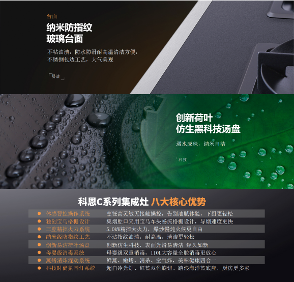值得一提的是科恩C系列集成灶在用戶最為犯難的清潔打理方面也頗為用心,全系采用納米防指紋玻璃臺(tái)面,不沾油漬,防水防滑耐高溫,清潔尤為便捷,臺(tái)面四周為不銹鋼包邊工藝,不僅外觀美觀大氣,而且可以有效防止湯汁滲漏滴落至地面,從而杜絕滑倒等意外情況的發(fā)生。另外,湯盤采用的是創(chuàng)新荷葉仿生黑科技湯盤,納米自潔,滴油不沾,遇水成珠!不難想象,在擁有如此黑科技的集成灶上烹制美食,該是一種多么難以言喻的放松和愜意!
