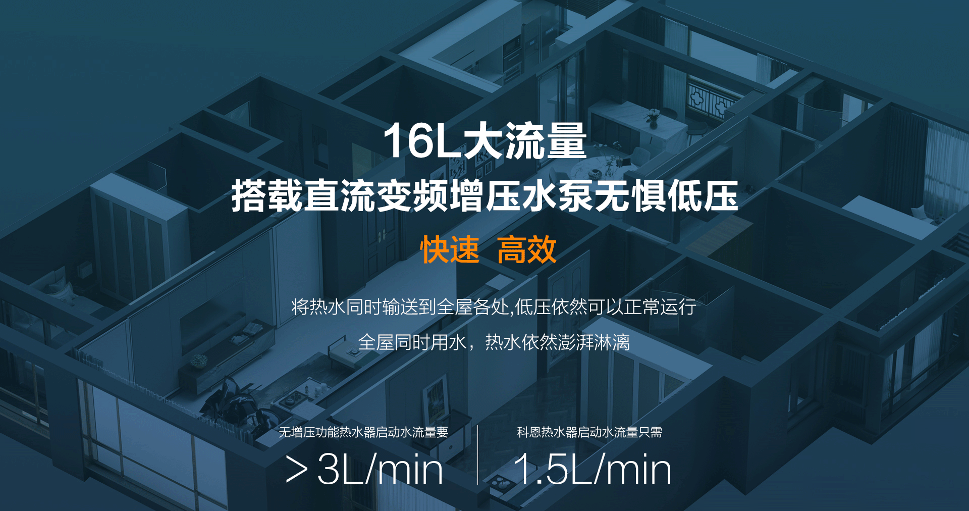 智能增壓,快速高效:16L大流量搭載直流變頻增壓水泵,根據風壓智能改變轉速,將熱水同時輸送到全屋各處,低壓依然可正常運行,全屋多點用水,熱水依然澎湃淋漓,出水更快,更有效率,別墅、高層完全不帶怕的。
