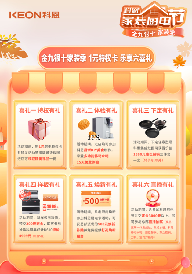 金九銀十家裝季,科恩集成灶推出科恩家裝廚電節(jié),不僅有1元家裝特權(quán)卡,0元搶廚電,提前鎖定直播抽大獎(jiǎng)名額,還能樂享六大喜禮,特權(quán)有禮、下定有禮、樣板有禮、煥新有禮、直播有禮,進(jìn)店即可參加科恩月餅DIY美食制作,還有15天移動(dòng)水吧免費(fèi)體驗(yàn),一塊錢就能買到的快樂,怎么算都劃算!
