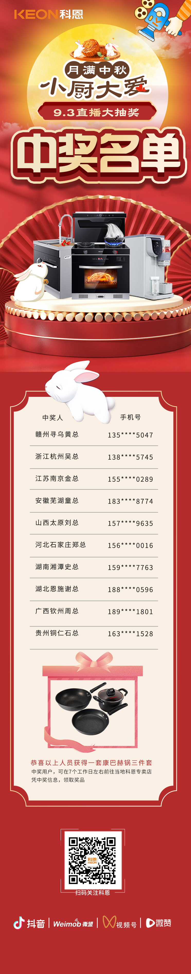話不多說,先來公布9月3日晚第二期月餅DIY直播現(xiàn)場(chǎng)中獎(jiǎng)名單,恭喜以下10位幸運(yùn)寶寶!請(qǐng)?jiān)谄邆€(gè)工作日左右,憑中獎(jiǎng)信息到當(dāng)?shù)乜贫鲗Yu店領(lǐng)取您的專屬獎(jiǎng)品!沒有中獎(jiǎng)的寶寶也不用氣餒,沒準(zhǔn)下一期的直播大獎(jiǎng)就在向你招手!你就是幸運(yùn)錦鯉本鯉!
