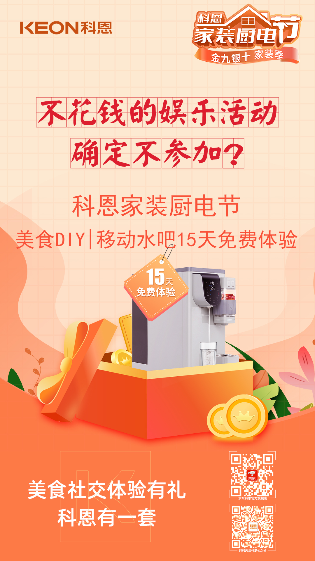 明天就是周末了,別只在家擺爛!可逛街費(fèi)錢,宅家費(fèi)電,有沒有什么不花錢又能carry全場的娛樂活動?來科恩家裝廚電節(jié),場地、設(shè)備、機(jī)器早已準(zhǔn)備就緒,美食DIY,沉浸式體驗,共同制作美食,一起分享心得,還有15天免費(fèi)體驗的移動水吧帶回家,美食社交,體驗有禮,確定不參加?