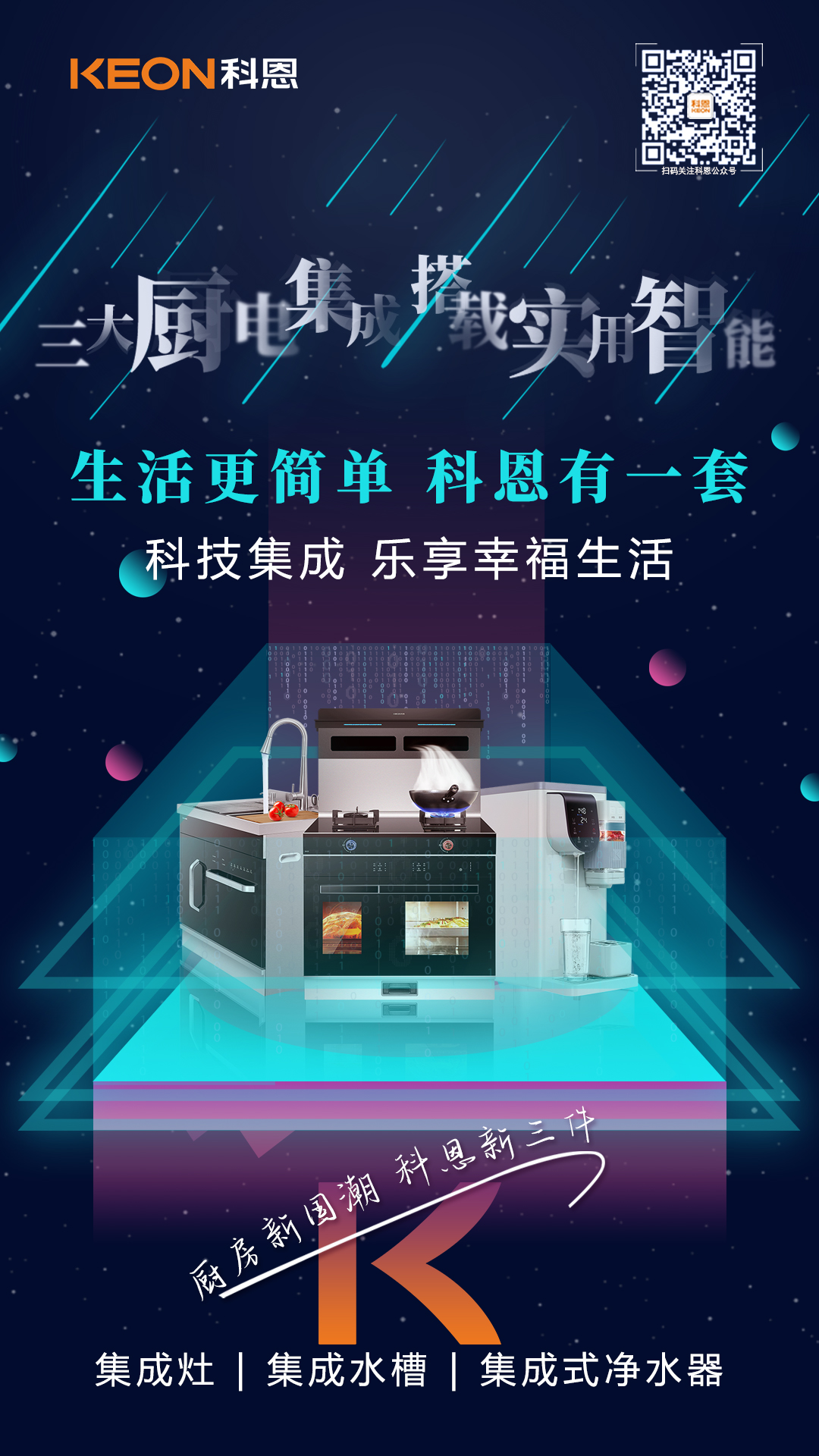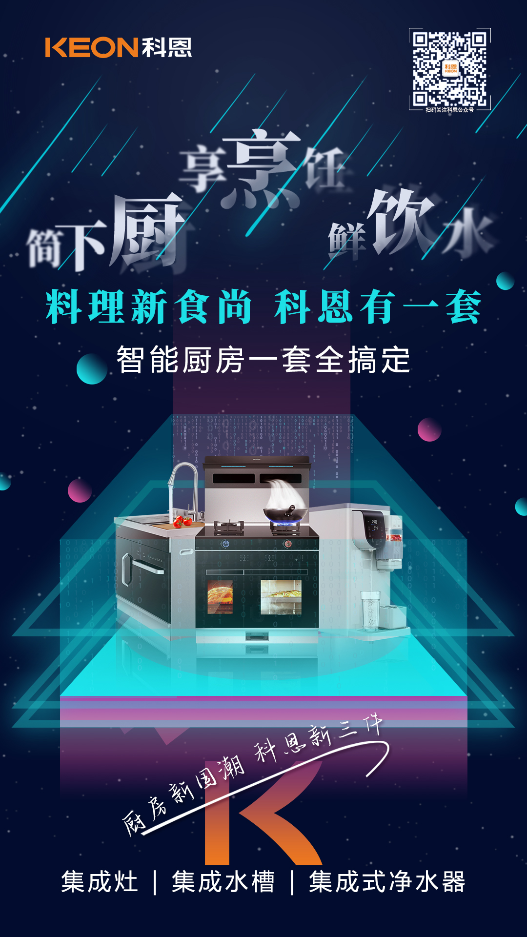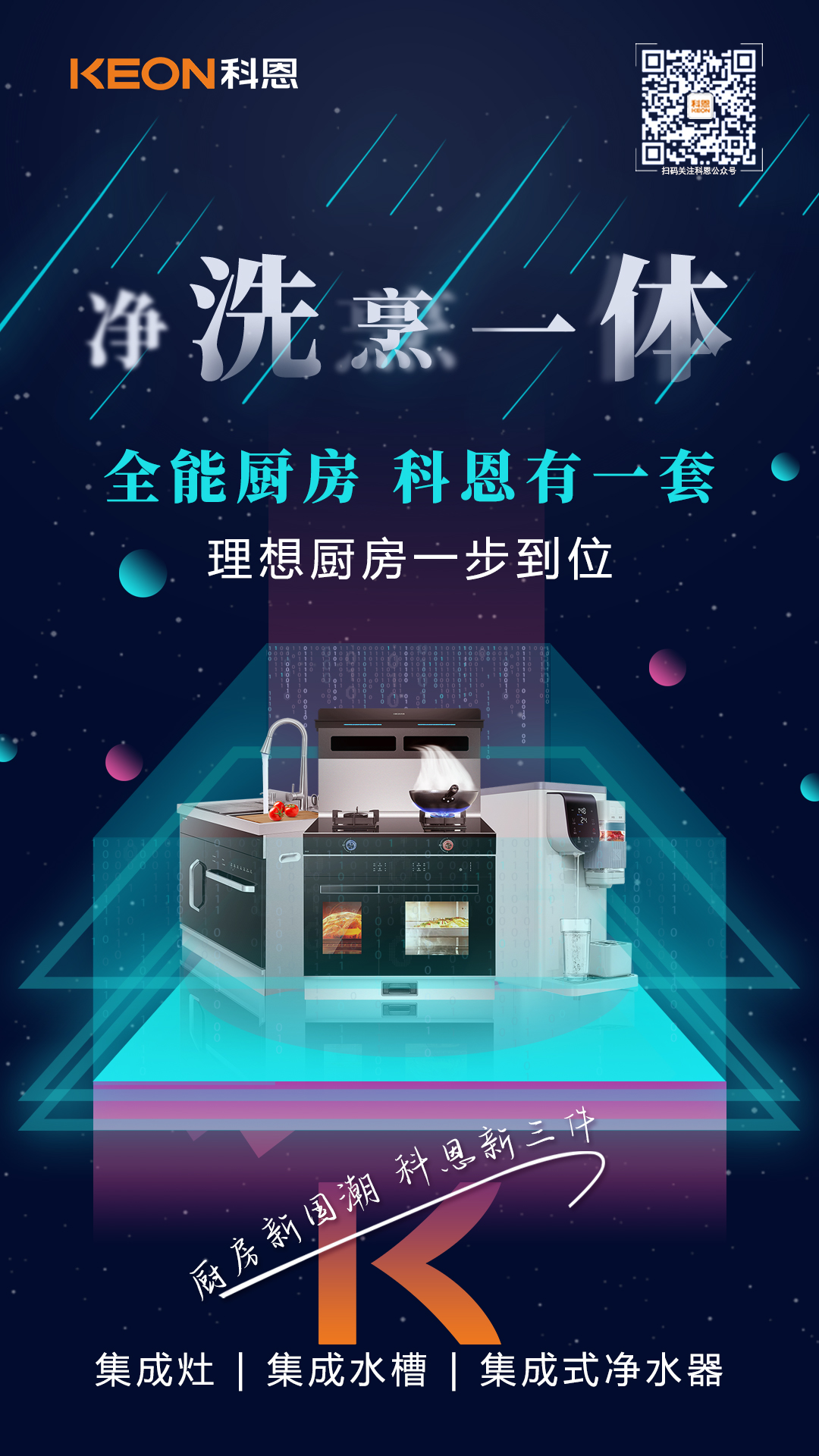 為此,科恩集成灶延續(xù)“樂享智慧廚房”理念,立足創(chuàng)新,大膽突破固有思維定式,跳出單品同質(zhì)化現(xiàn)狀,勾勒出了“廚房新國潮,科恩新三件”為主題的未來廚房場景——以集成灶為代表的“烹”為中心、以集成水槽洗碗機(jī)為代表的“洗”為中心、以集成式凈水器的“飲”為中心,整合了科恩電器全系產(chǎn)品資源,構(gòu)建多層次、全體系的廚房體驗(yàn),為用戶提供更立體、更豐富的廚房解決方案!