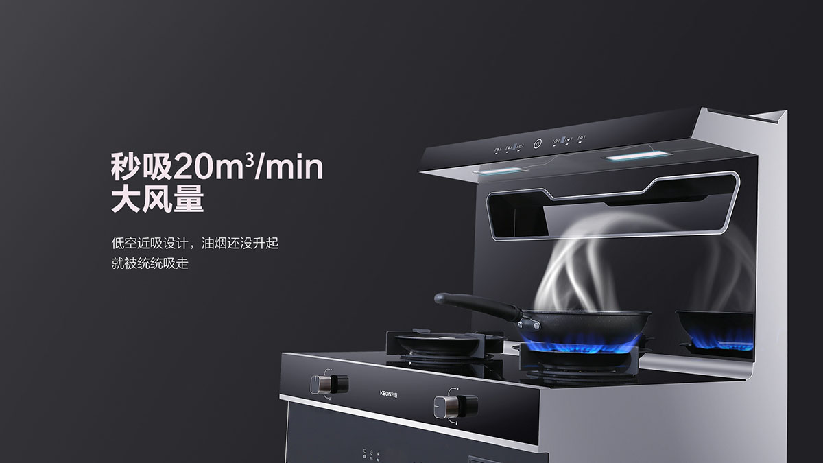 • 低空近吸技術,緊鎖升騰油煙不上臉,吸煙快人一步,油煙無處可逃