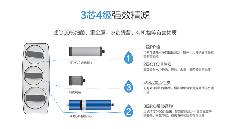 - 三芯四級(jí)強(qiáng)效精濾,濾除99%細(xì)菌重金屬