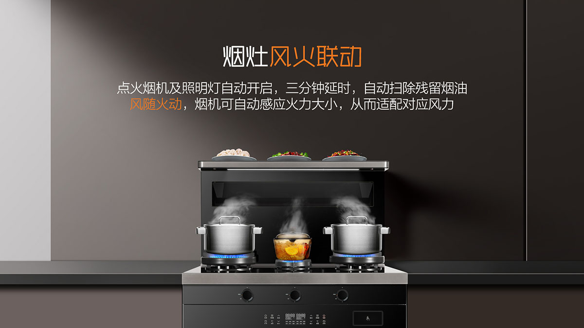 - 煙灶風(fēng)火聯(lián)動(dòng),點(diǎn)火煙機(jī)及照明燈自動(dòng)開(kāi)啟,風(fēng)量隨火力大小自動(dòng)調(diào)節(jié)
