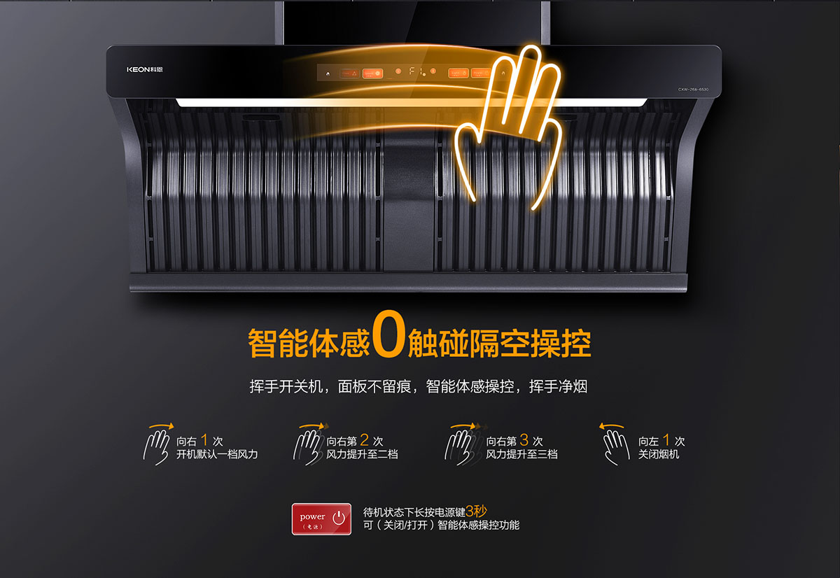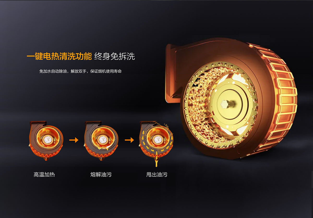 • 一鍵電熱智清洗,終身免拆洗,葉輪風柜壁自動除油,解放雙手