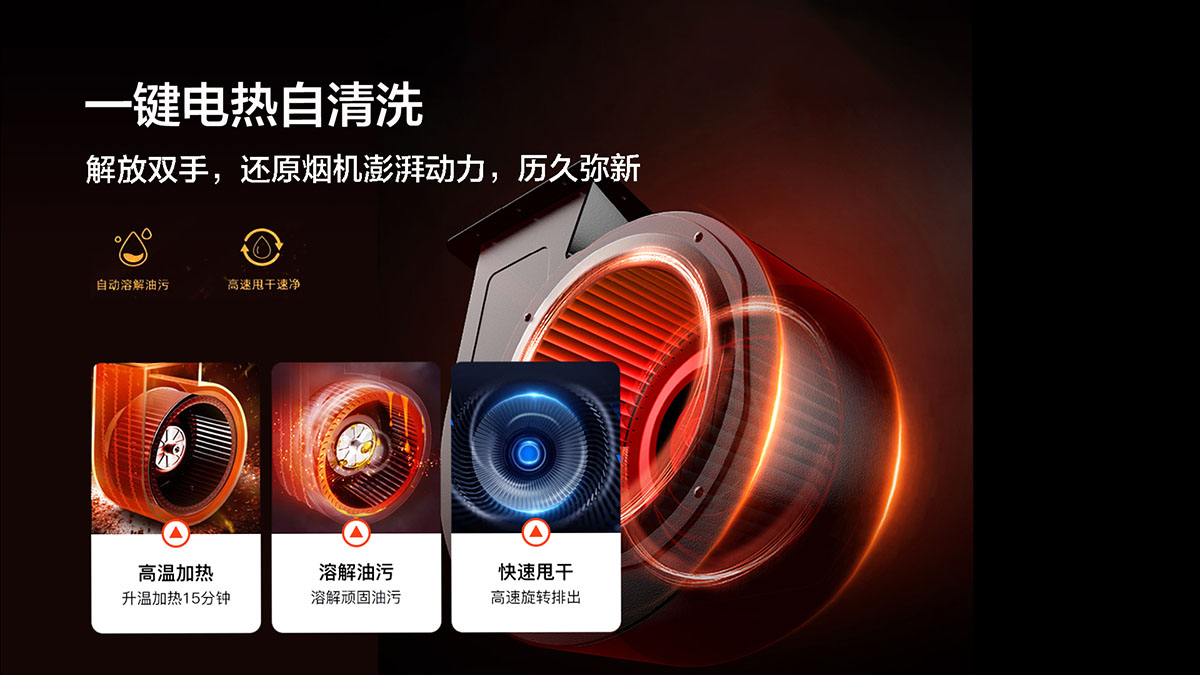 • 一鍵電熱自清洗,解放雙手,還原煙機澎湃動力,歷久彌新
