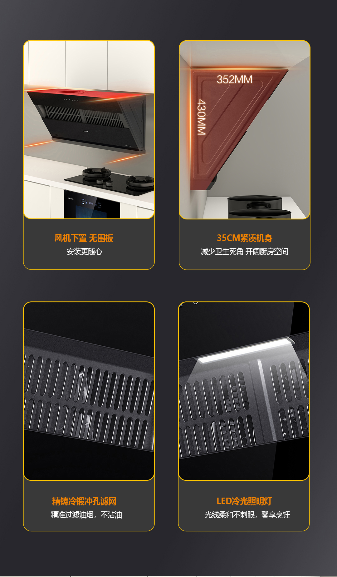 - 攏、吸、排三點一線,暢吸直排,高效凈煙