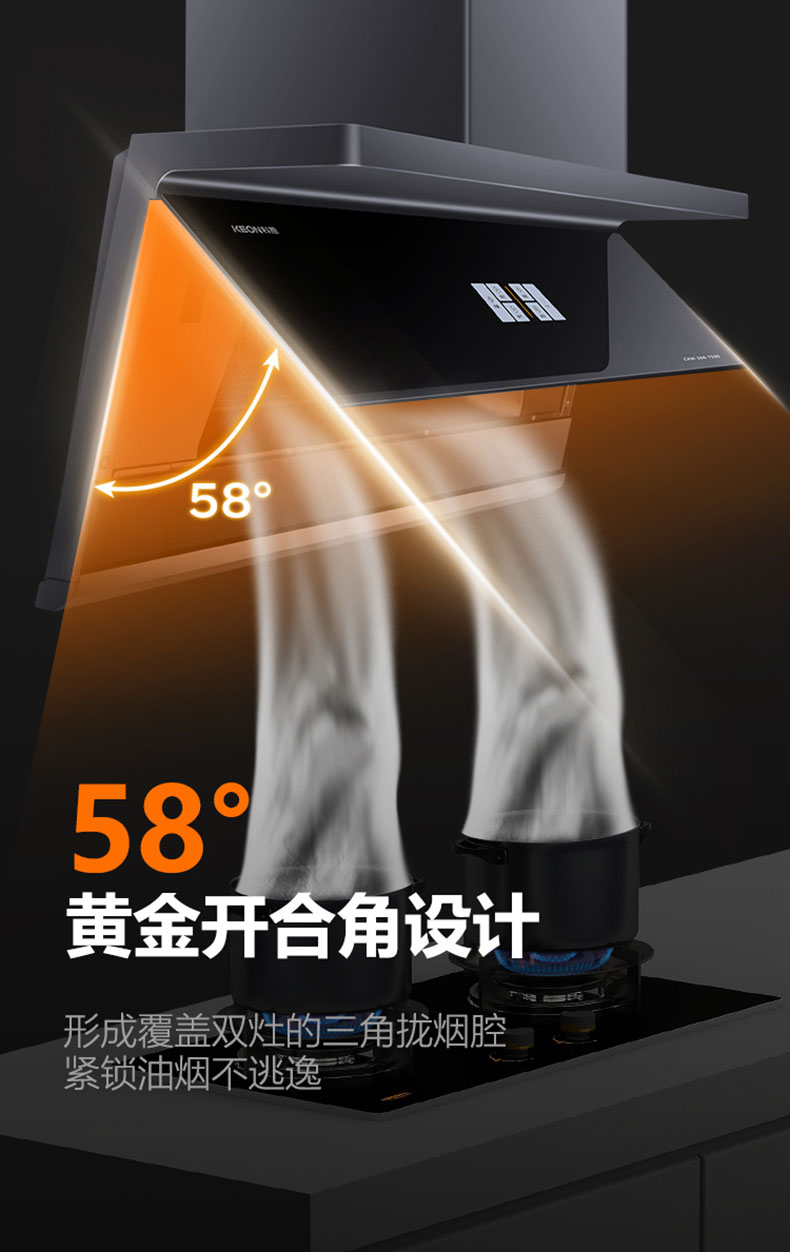 - 采用58°黃金開合角,緊鎖油煙不逃逸